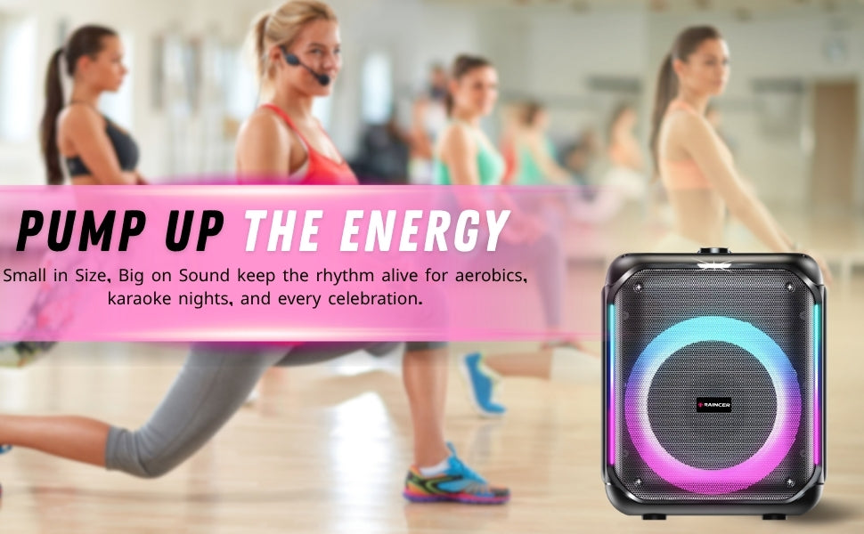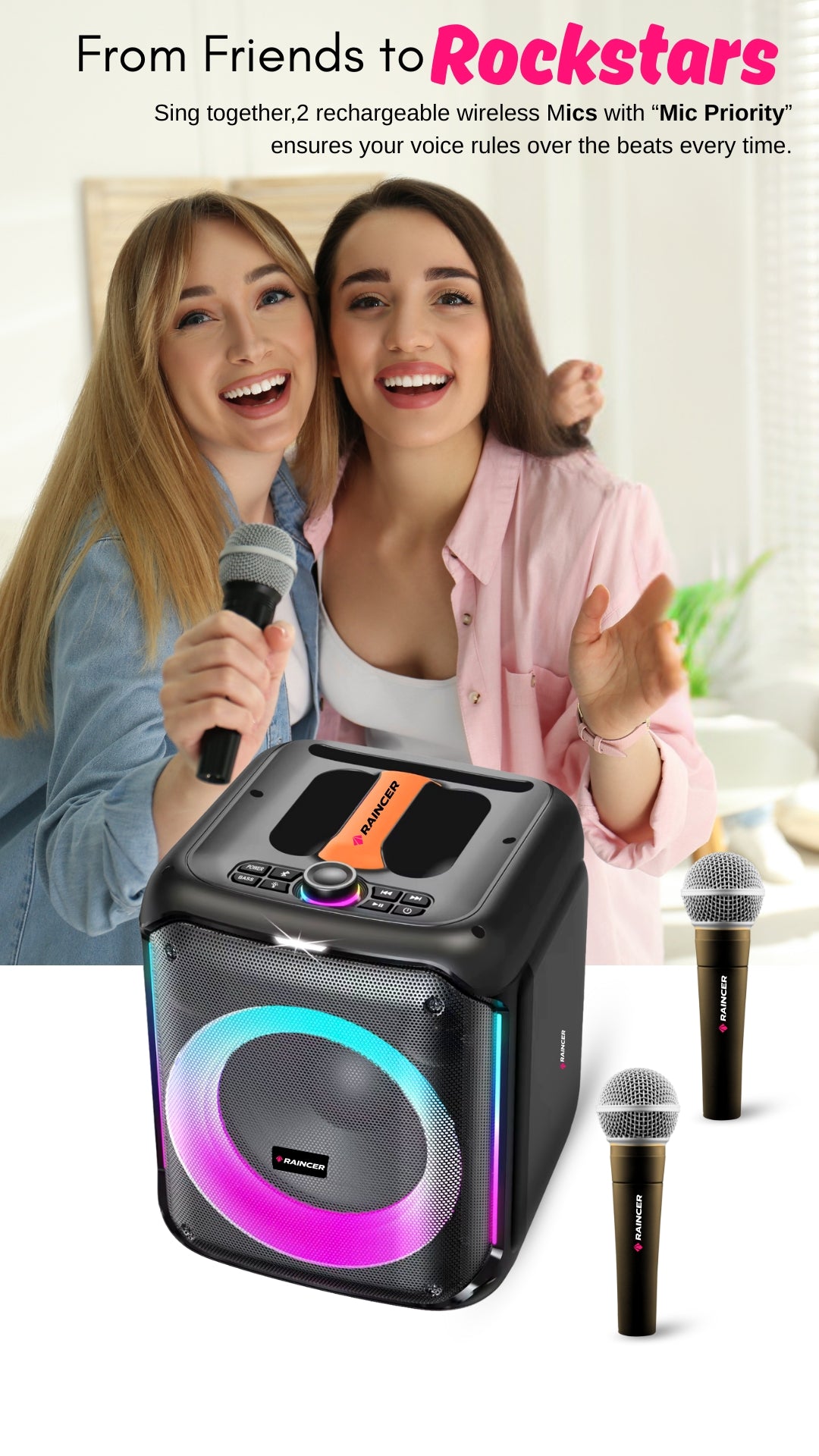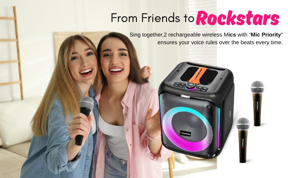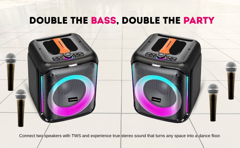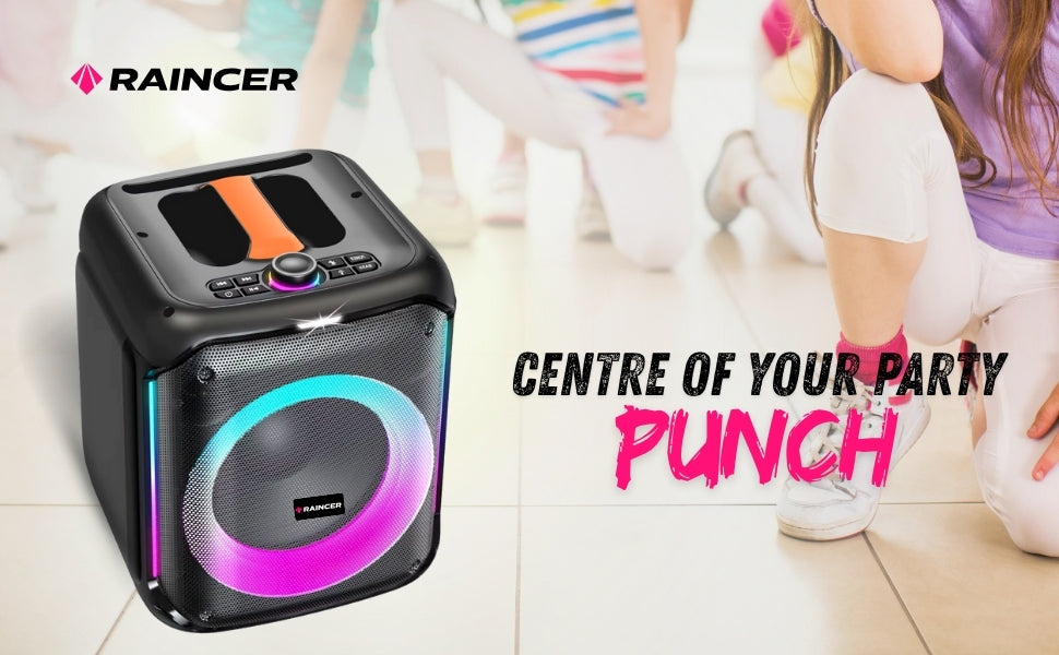 Raincer® Punch Portable Party Speaker with Dual Wireless Mics, Heavy Bass, Voice Changer, LED Light Control, USB/BT/FM/Line-In, Recording, Mic Priority, Stand Support & Remote (Rechargeable)