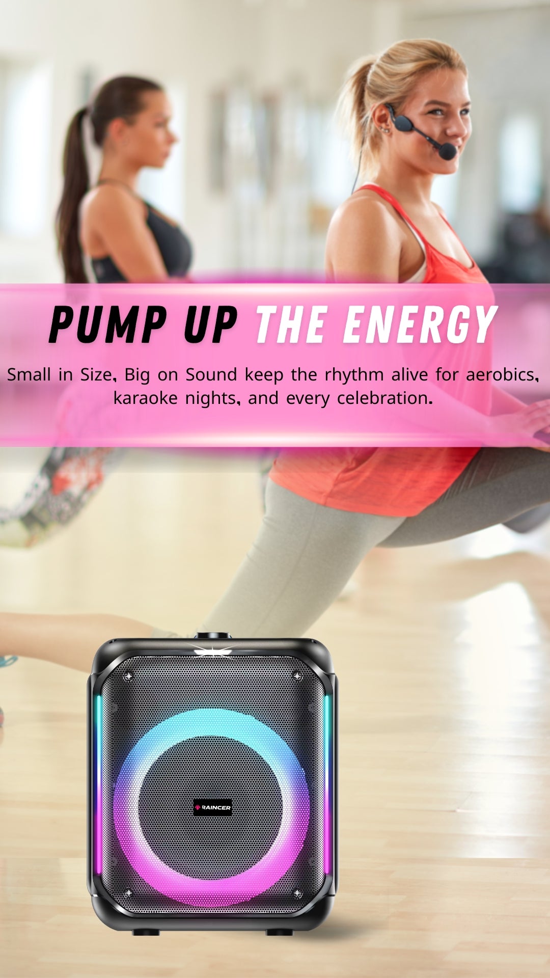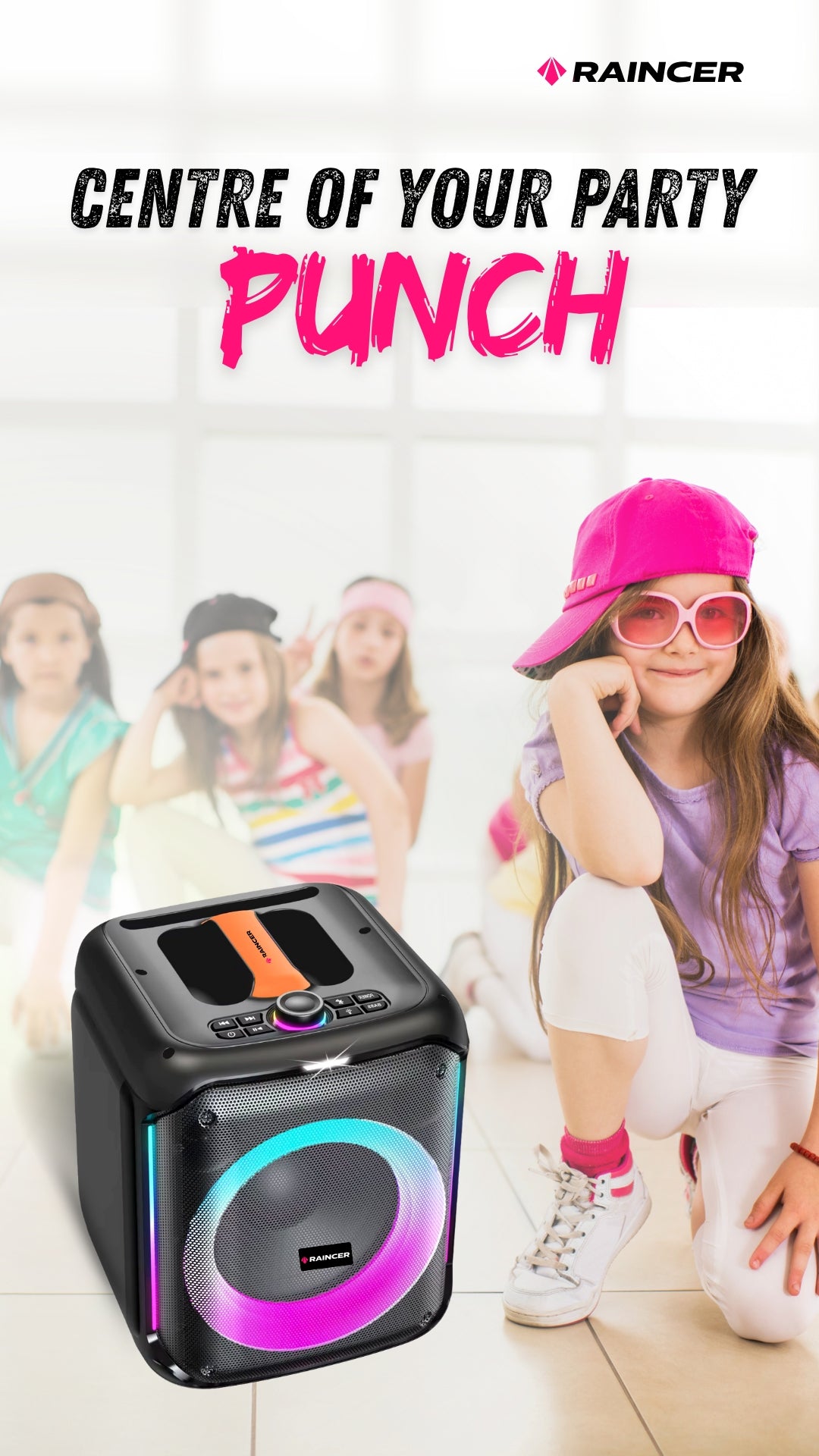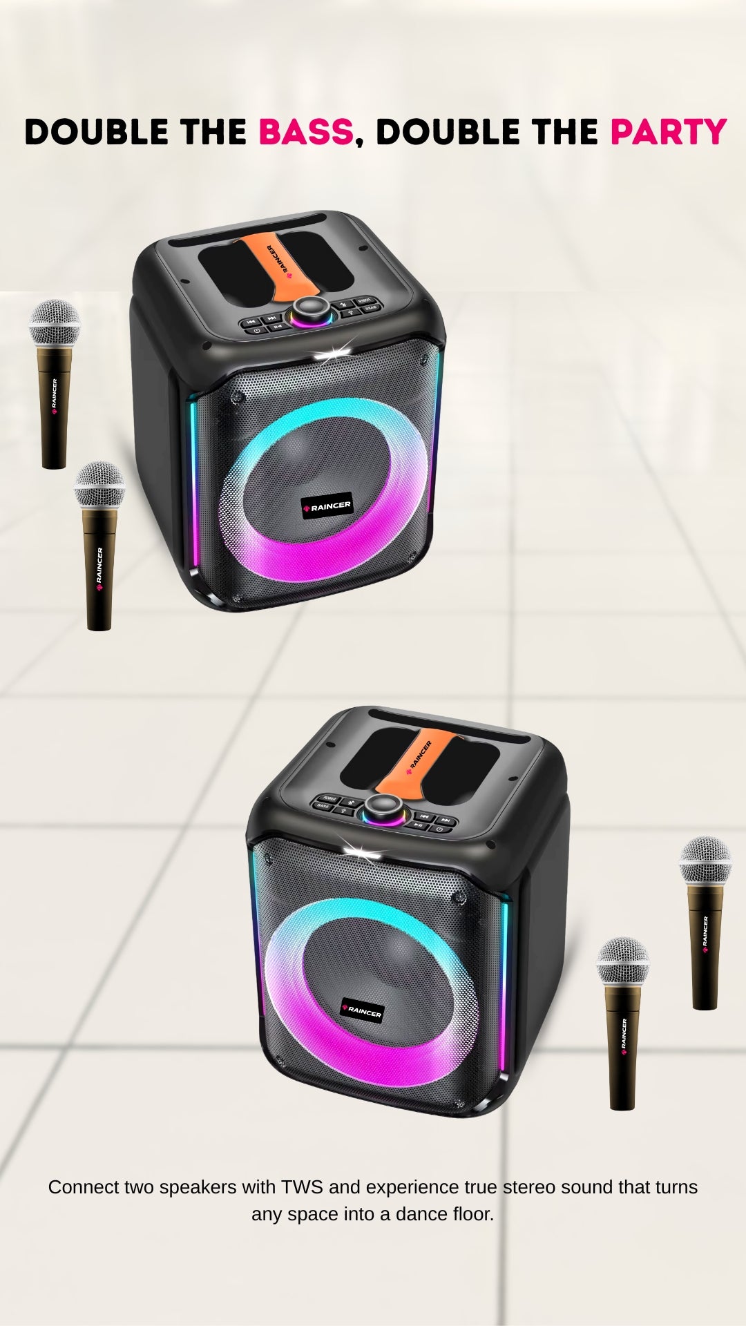 Raincer® Punch Portable Party Speaker with Dual Wireless Mics, Heavy Bass, Voice Changer, LED Light Control, USB/BT/FM/Line-In, Recording, Mic Priority, Stand Support & Remote (Rechargeable)